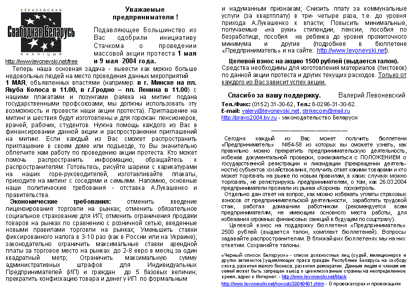 У Владимира Левоневского были изъяты: Бюллетень «Предприниматель» №54-58 – общее количество 245 экземпляров, листовки с приглашением на санкционированные митинги 1мая 2004года и другие печатные материалы. Также был изъят полиэтиленовый пакет.
