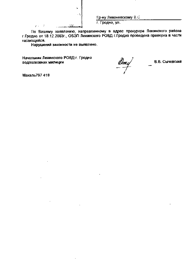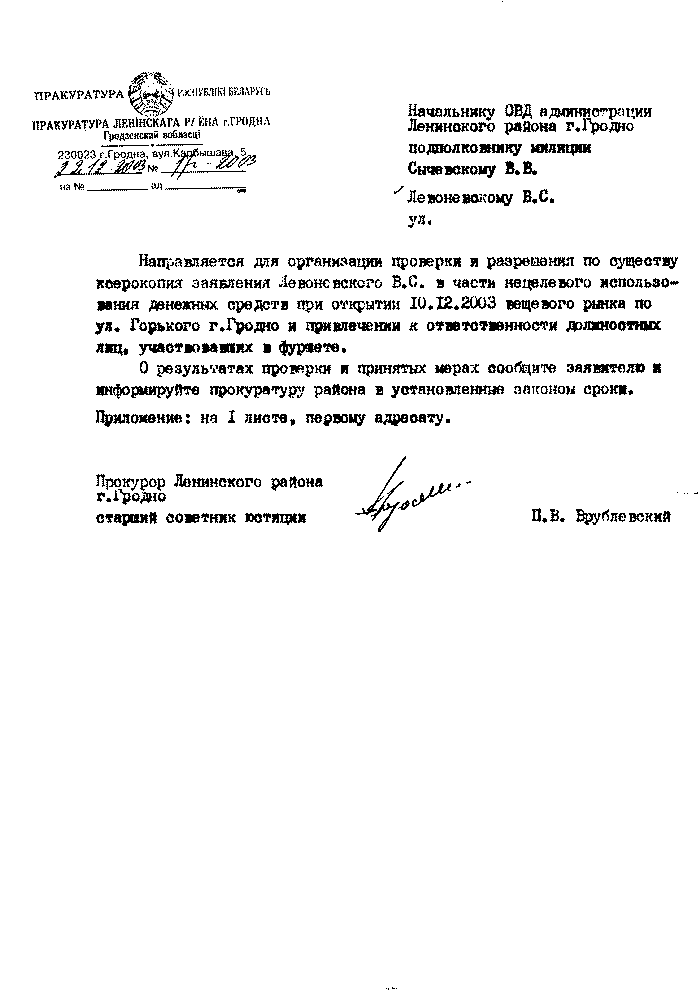 - Ответ из прокуратуры Ленинского района г.Гродно от 22.12.2003 (Начальнику ОВД администрации Ленинского района г.Гродно)