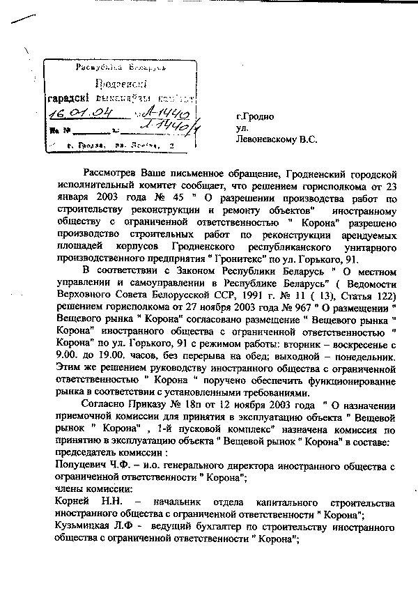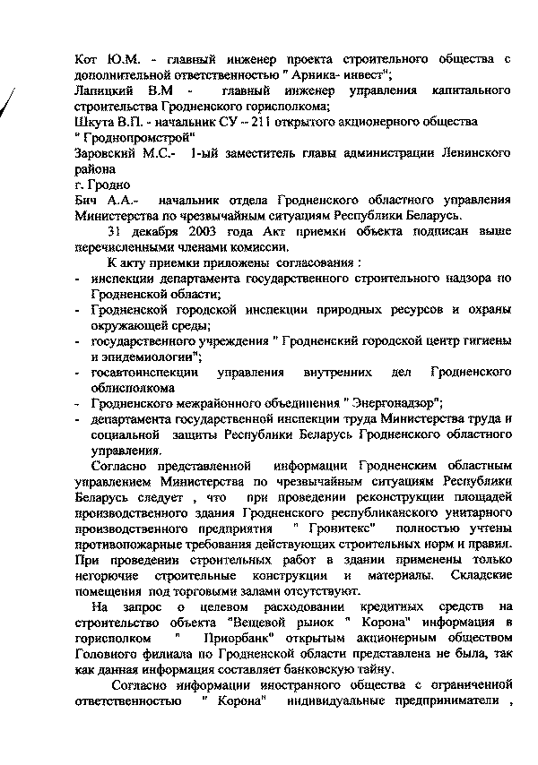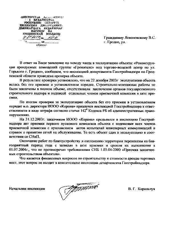 И это несмотря на то, что согласно письма начальника Госстройнадзора от 9.01.2004, что объект (рынок «Корона») принят в эксплуатацию только 31.12.2003, и по состоянию на момент открытия рынка, строительно-монтажные работы были не закончены, а руководство рынка привлечено к административной ответственности в виде штрафа по ст.142 КоАП Республики Беларусь.