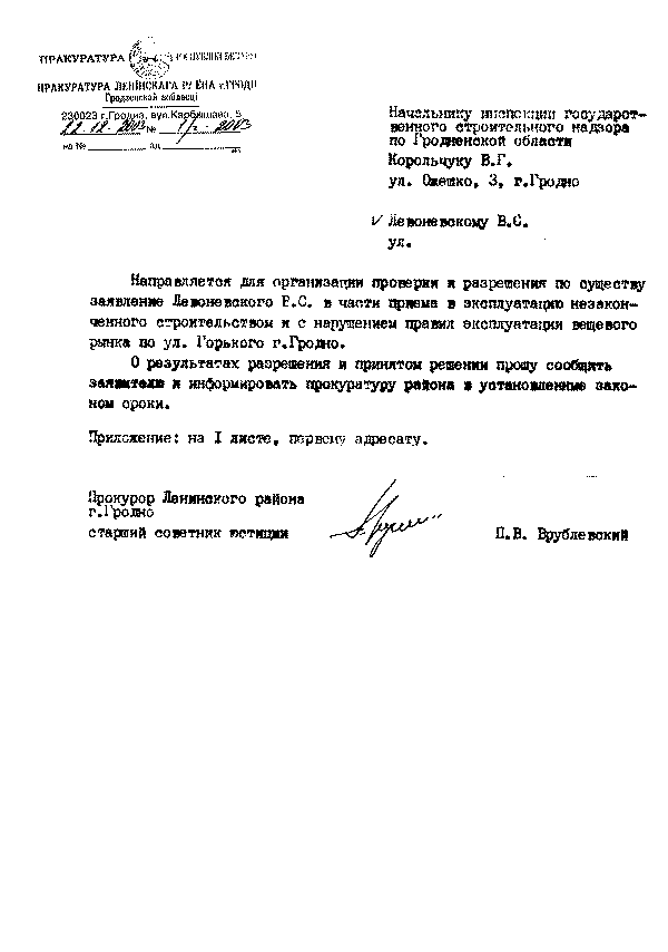 - Ответ из прокуратуры Ленинского района г.Гродно от 22.12.2003 (Начальнику инспекции государственного строительного надзора по Гродненской области)